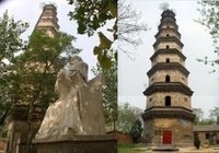 古塔第一级残存的石门楣上,有刻字四行:明道二年癸酉岁三月一日丙寅时戊寅日葬舍利院主僧**建**功德塔。这些记载成为塔体建筑的最准确和最具历史真实的时间。第四级塔室北墙上有三尊石雕像。雕石两块并列镶嵌于墙上,靠东的一块正中雕有两尊佛像,东边一座为盘膝背面像,西边一座为盘膝正面像,靠西的一块正中雕有一座盘膝正面佛像,左右各刻有"佛心"、"供养"字样。