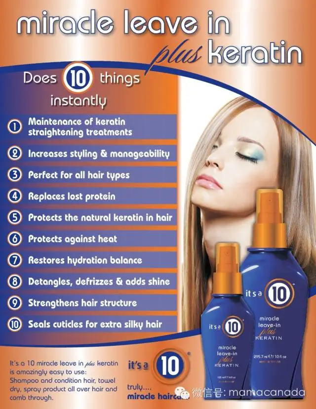 这是一个神奇的护发产品! It's a 10 miracle leave -in Plus Keratin 十全十美奇迹喷雾,含有角蛋白,带给头发和发根更为深层的滋润,从天然的亚麻籽、杏仁和燕麦中提取营养作用于头发上。