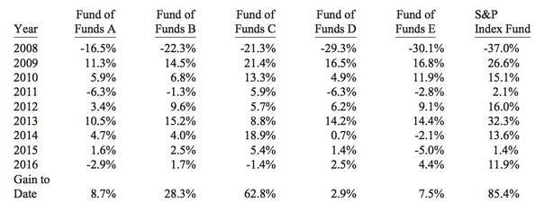 不过,我们还没有结束收费。记住,同样需要“喂饱”组合基金经理。这些经理会额外收取固定的手续费,通常为资产总额的1%。这样一来,尽管5只组合基金的整体表现不佳,但一些经理还是过了几年的好日子,并收取了“业绩”报酬。因此,我估计在过去9年里,5只组合基金获得的收益中有约60%都流向了两类基金经理的腰包!这就是他们为达成所谓业绩而给自己发放的无耻奖励。在几乎不用付出成本的情况下,数百位有限合伙人仅凭自己的力量都能轻易实现这些业绩。