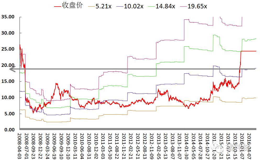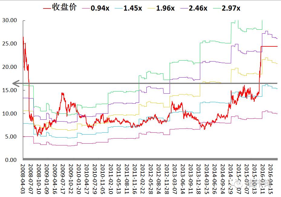 如果我们按照熊市中10年——14年平均市盈率,1.5倍给予的话,股价大概是16/17元左右(灰色箭头)。