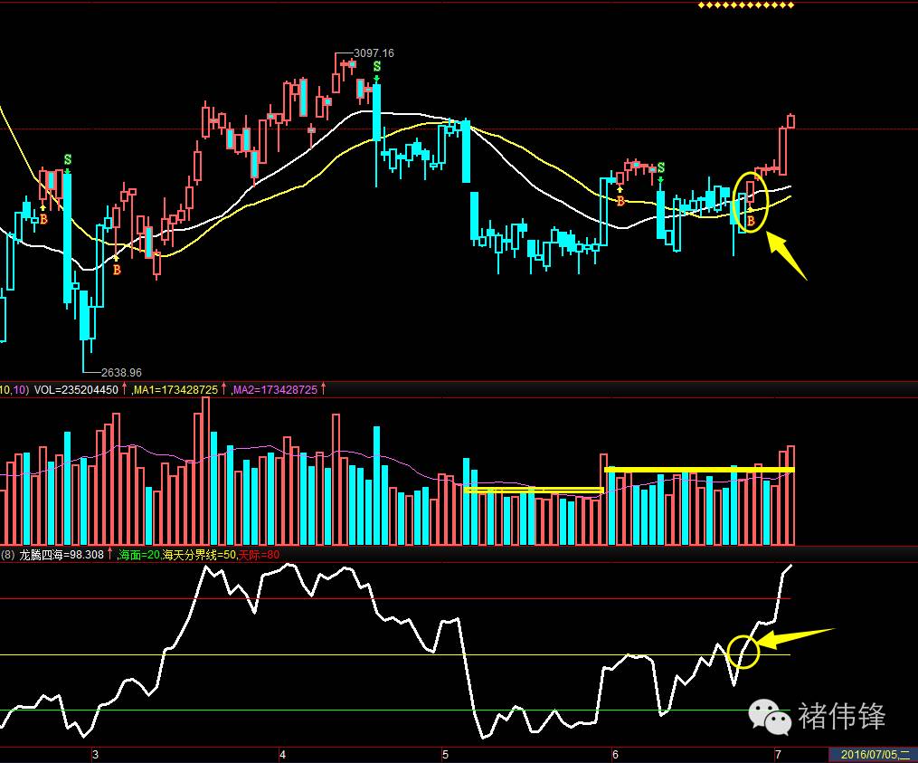 上图,B点、上河,LTSH上黄线,成交量上一个台阶。