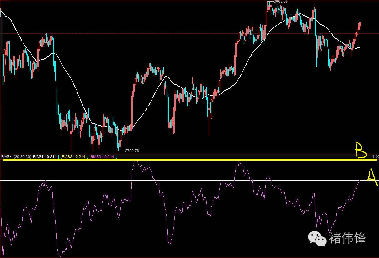 30均线的BIAS,目前已经到了A这个位置,是一个有一定乖离的位置。 如果到B肯定要出现调整的。