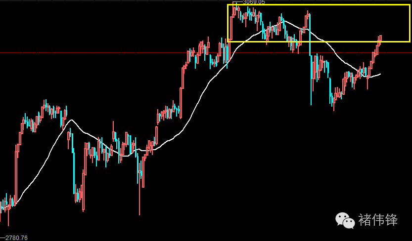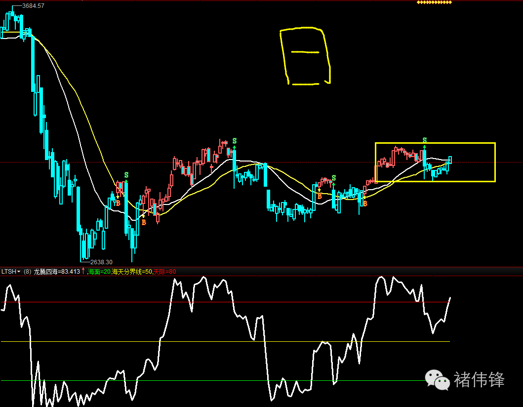 上图,大盘的龙腾四海还在黄线上,说以依然是强势。所以,我目前先把他当做箱体来看待。