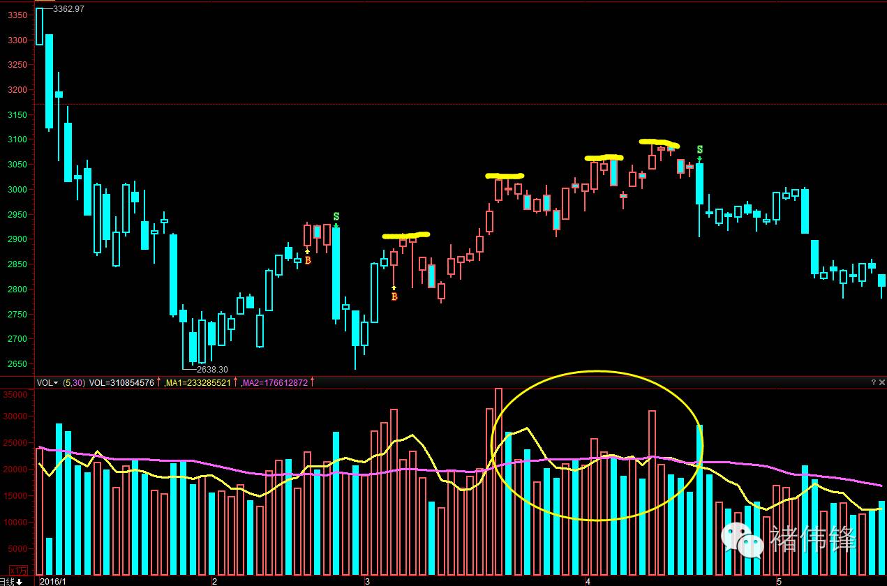 上图,今年熔断后的反弹,光看趋势很漂亮,一个个头部太高,但是成交量跟不上,那么我们要特别当心。 一旦S点出来,那肯定要跑的。