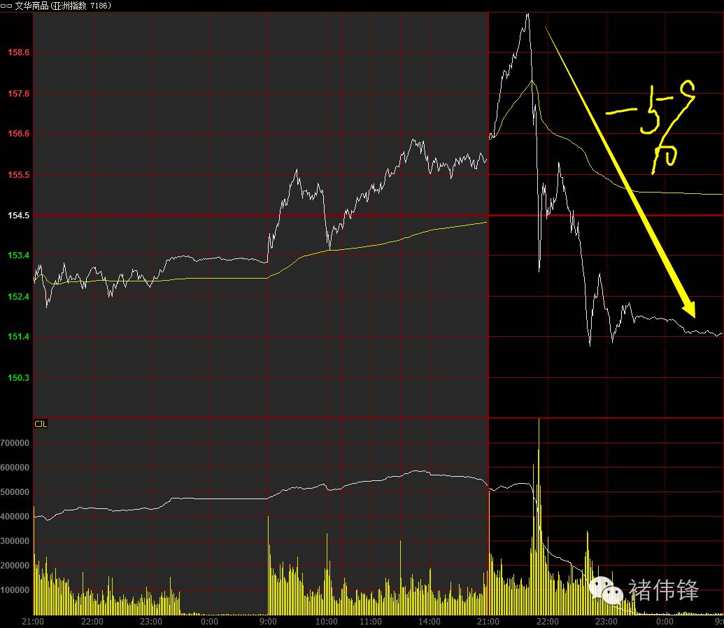 上图是“文华商品”的走势,他是跟踪国内主要商品期货的一个指数,比较有代表性。我们看到一下子从高点杀了5%,