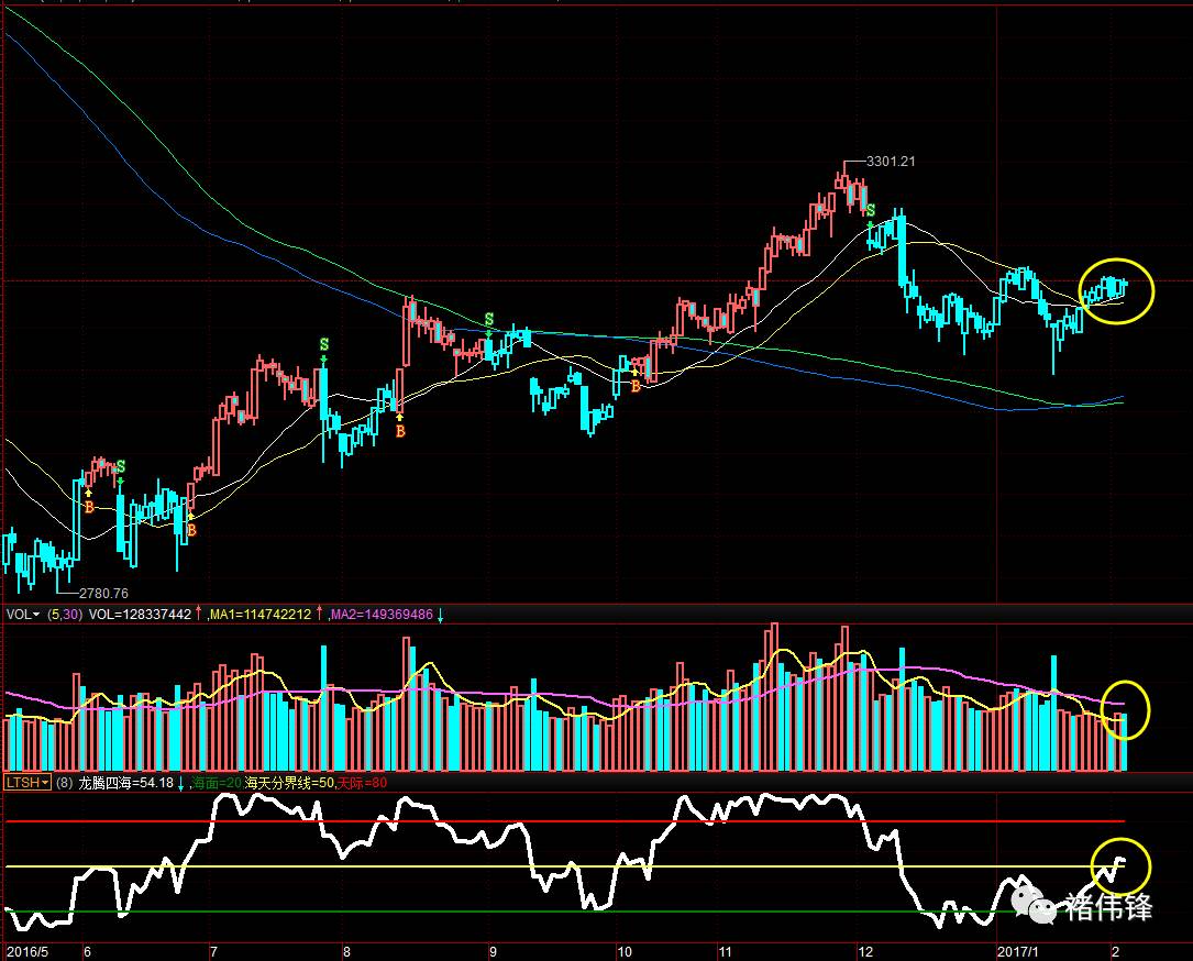 上证指数日线,LTSH已经走强,“河”也已经站上。 现在还差成交量的突破和操盘线的B点。