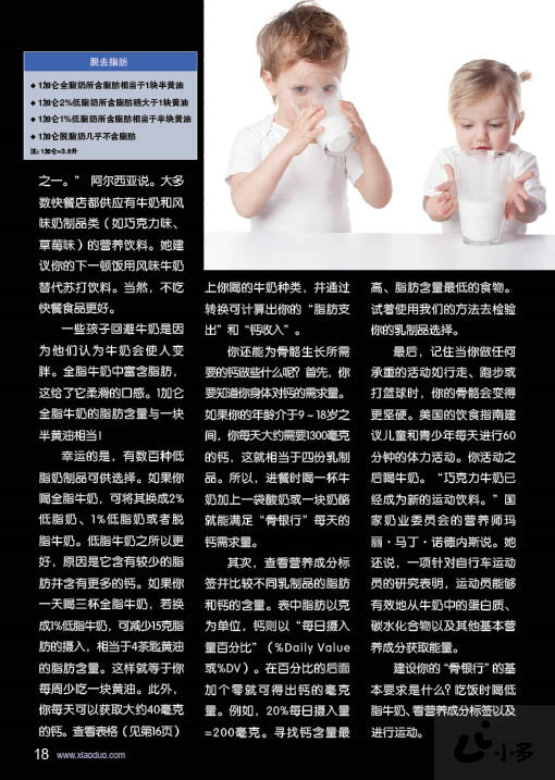 你能为骨骼生长所需要的钙做些什么呢?首先,你要知道你身体对钙的需求量。如果你的年龄介于9~18岁之间,你每天大约需要1300毫克的钙,这就相当于四份乳制品。所以,进餐时喝一杯牛奶加上一袋酸奶或一块奶酪就能满足“骨银行”每天的钙需求量。其次,查看营养成分标签并比较不同乳制品的脂肪和钙的含量。表中脂肪以克为单位,钙则以“每日摄入量百分比”(%D a i l y V a l u e或%DV)。在百分比的后面加个零就可得出钙的毫克量。例如,20%每日摄入量= 2 0 0毫克。寻找钙含量最高、脂肪含量最低的食物。试着使用我们的方法去检验你的乳制品选择。最后,记住当你做任何承重的活动如行走、跑步或打篮球时,你的骨骼会变得更坚硬。美国的饮食指南建议儿童和青少年每天进行60分钟的体力活动。