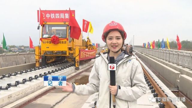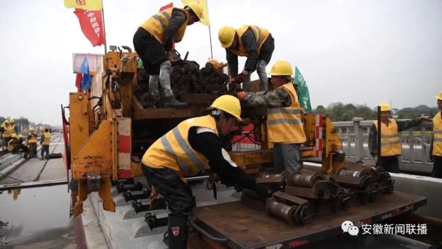 这里是位于安庆市怀宁县境内的合安高铁施工现场,随着有砟无砟一体式牵引车顺利将正线最后一对轨落到承轨槽,标志着
