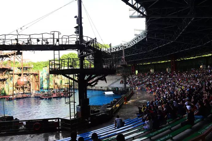 这是一个座无虚席的演出盛宴,在这里再现了《未来水世界》电影中的多项特技,熊熊火焰和冲天水柱在相互烘托下的爆炸演出,让人拍案叫绝