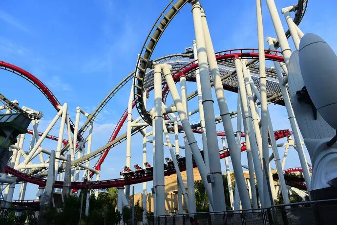 当然,在新加坡环球影城里最耀眼的还是这个世界上最高的“红灰双轨”过山车,它的灵感其实源自于“太空堡垒卡拉狄加”的电视剧,重力旋转、蛇形旋转、螺旋旋转、垂直旋转,彻底征服世界上的过山车迷。