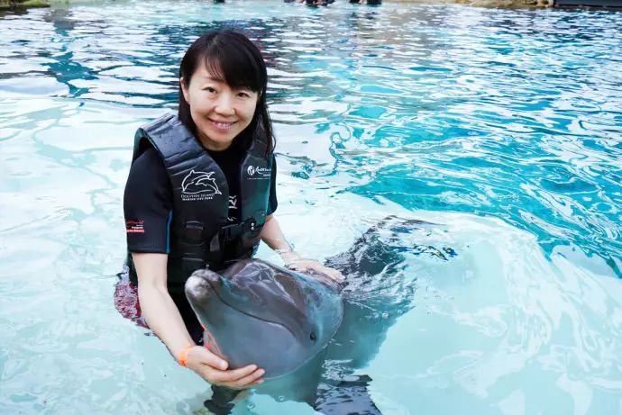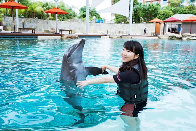 也是在海豚园里,我第一次体验海豚伴游,两条健硕的海豚用鼻子顶着我的脚心,让我以大约30码的速度在水里飞奔。它们顽皮地在水里“推波助澜”,贴身伴游简直畅快淋漓到极致。