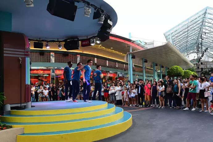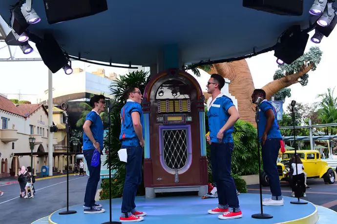 要离开环球影城的时候,碰到了几个帅气的男生,他们是梅尔斯餐厅的活力侍应生们,从好莱坞的街道边停泊的老爷车旁出来邀请你和他们一起舞蹈。