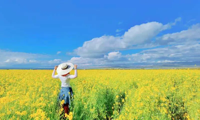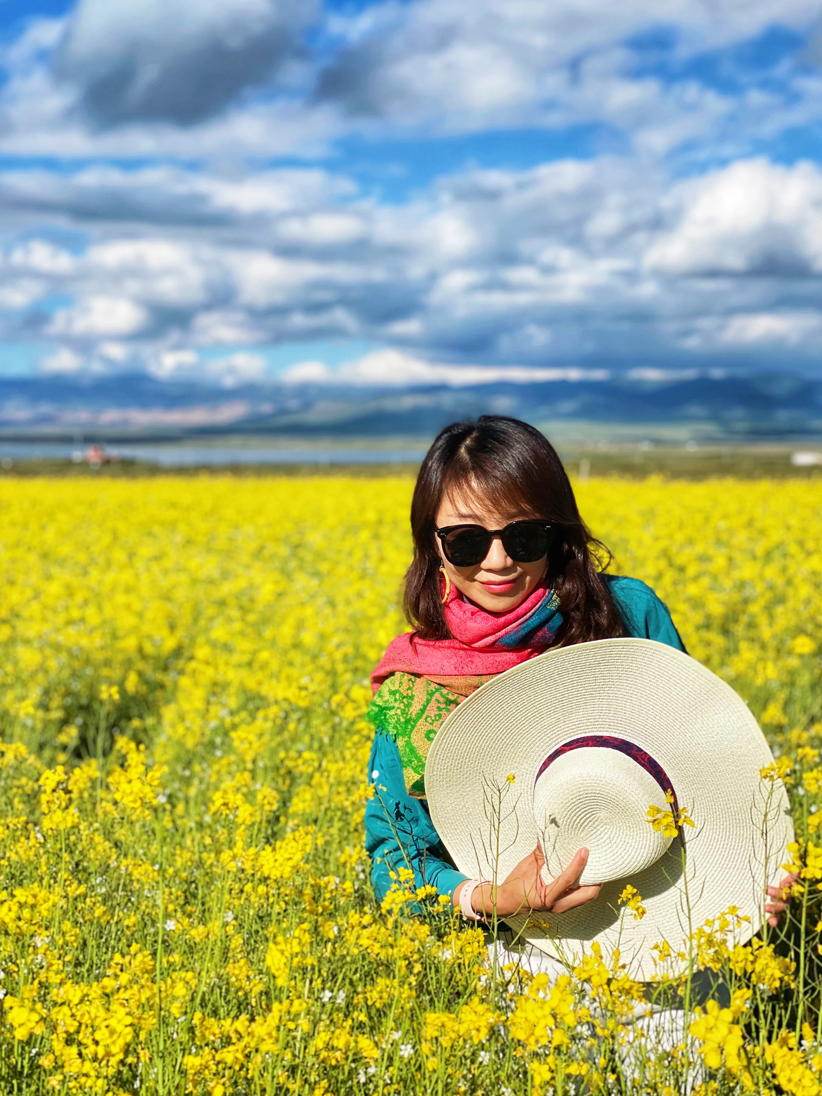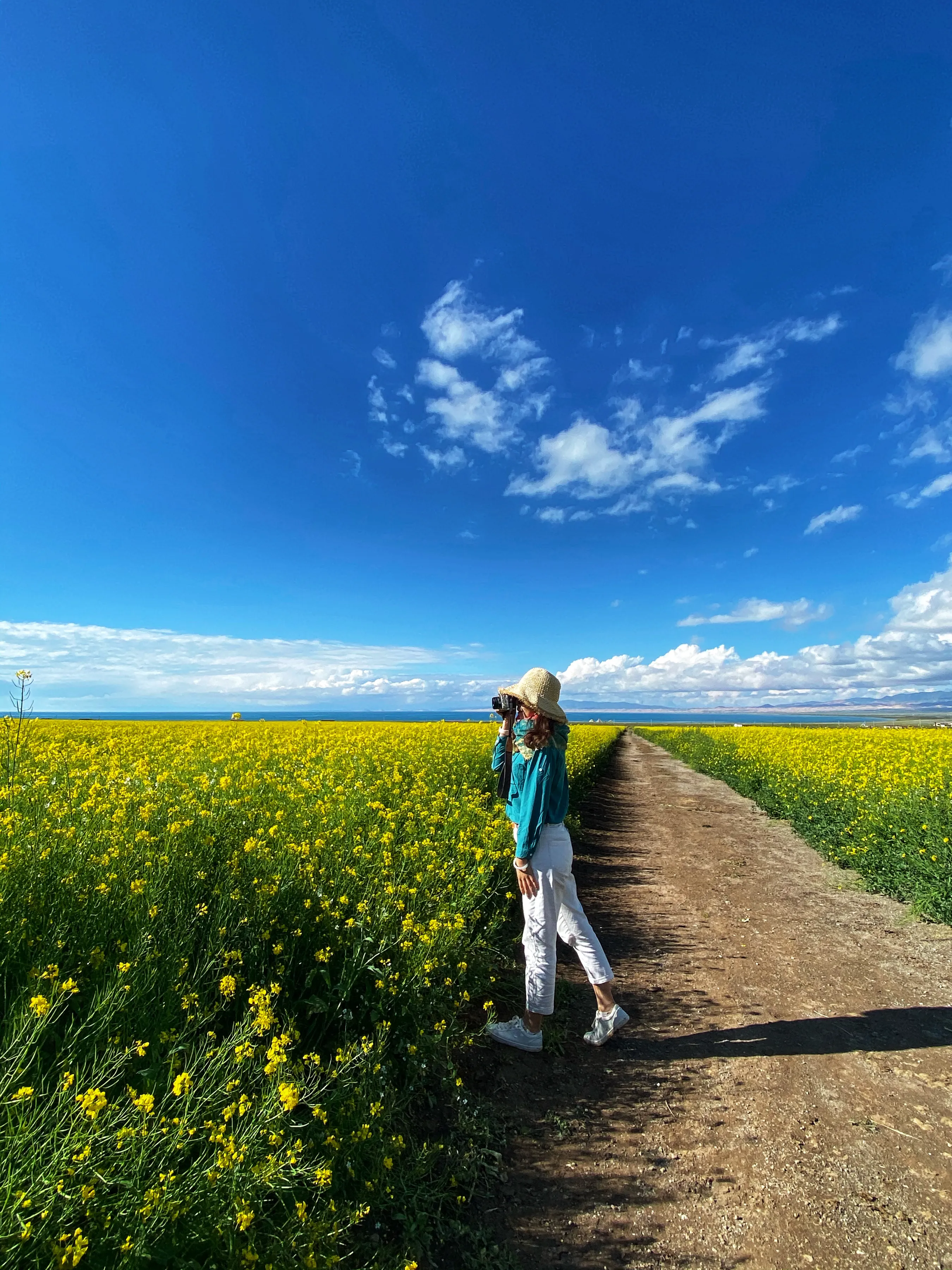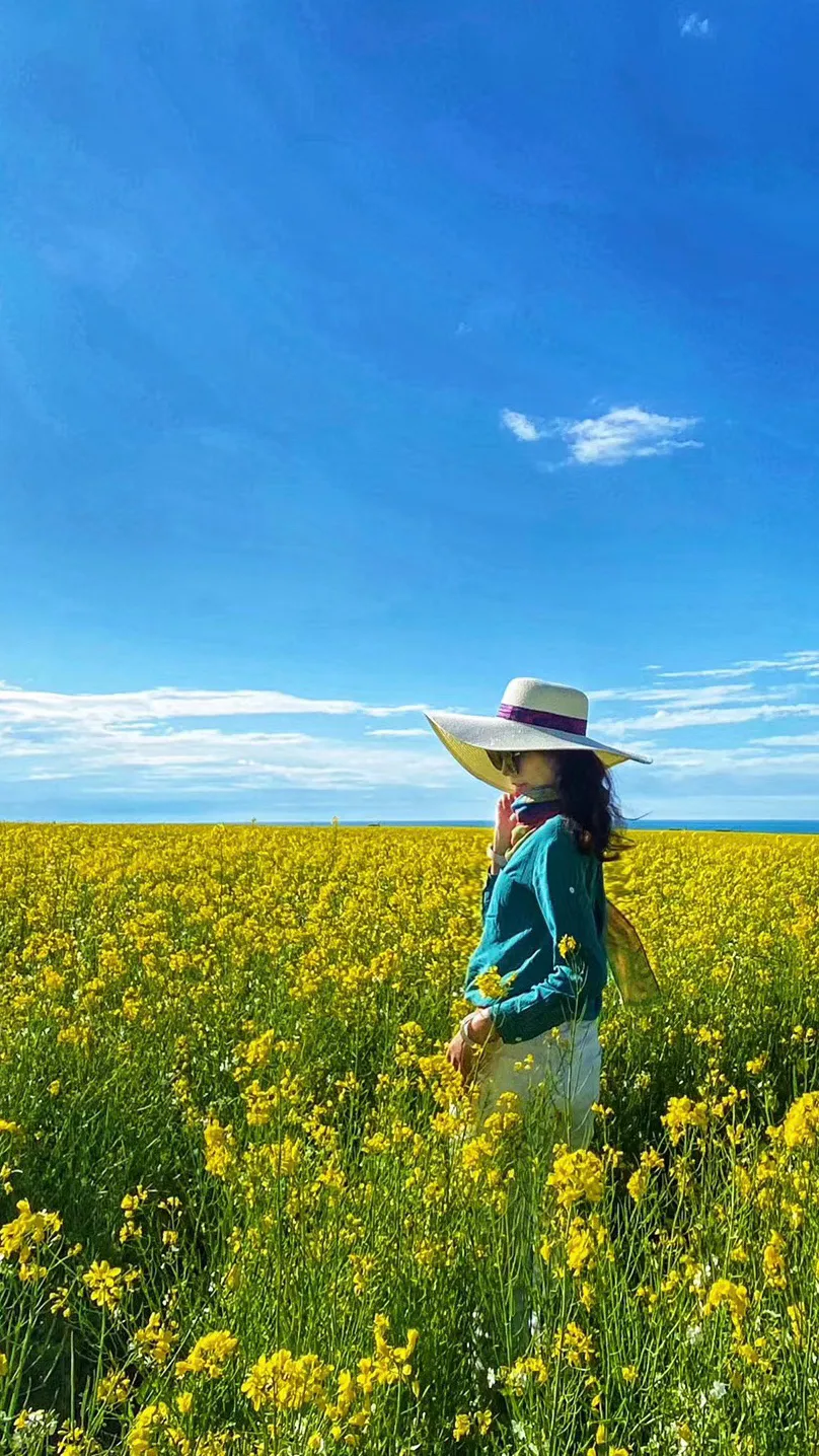 在青海湖重点需要拍摄油菜花海,黄色的花海配上白衣白裙比较漂亮,我闺蜜带的大帽檐的草帽在拍摄过程中特别出彩。那天我本以为自己穿的是一件墨绿色的衬衣颜色有些过重了,但是没想到用白色的大草帽当道具,也有意想不到的效果。而我闺蜜这张拿着帽子,在花海中的背影,更是让人有遐想无限。