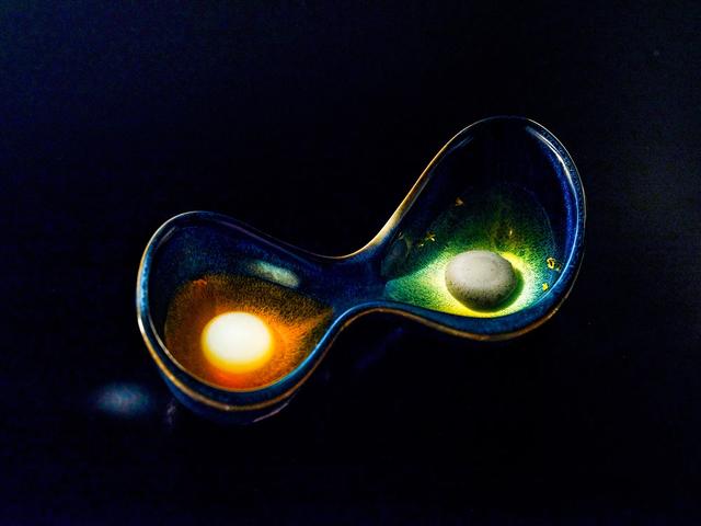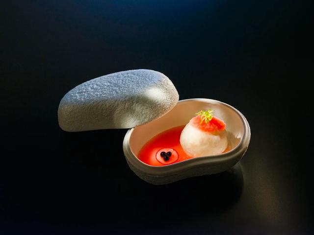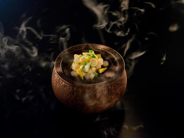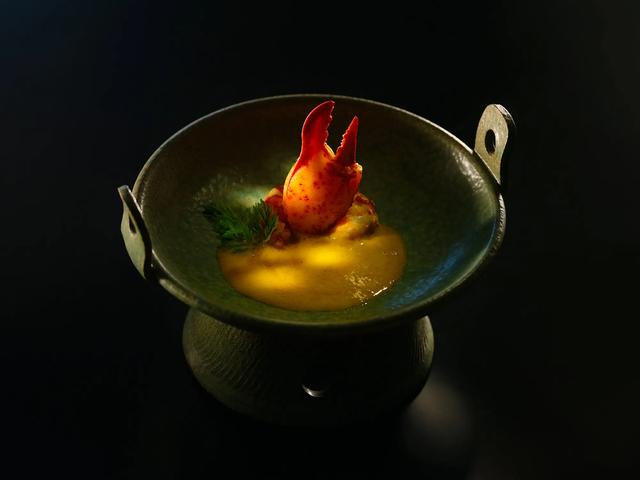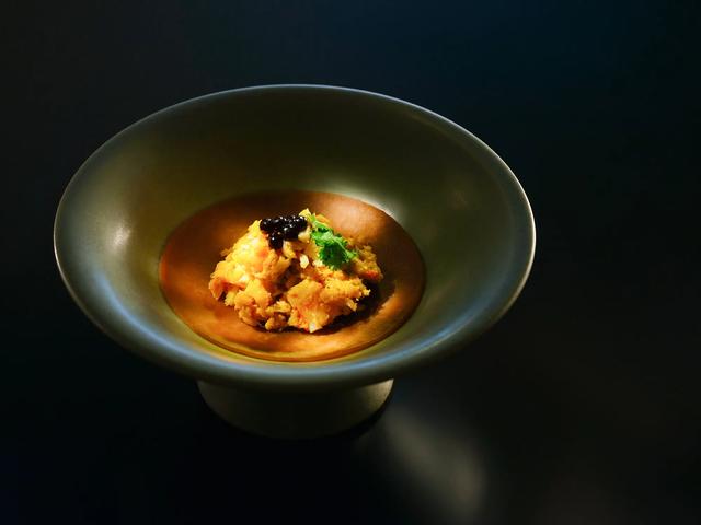 鸡油花雕蒸和乐蟹配陈村粉:陈师傅在原粤式传统名菜的基础上用和乐蟹取代花蟹,并在蒸煮过程中加入蚬和昆布以提升蟹的鲜味,最后加入手工自制的鸡油和鸡蛋液,使汤汁更为醇厚,软滑的陈村粉在汁水精华的滋润下更加活色生香,让人食欲大振。