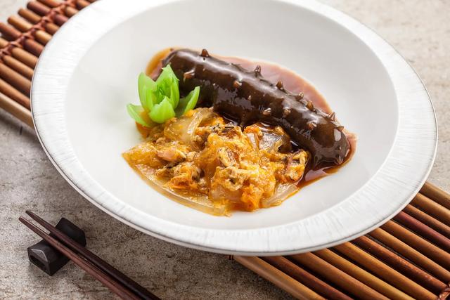 蟹粉粉皮煮辽参:廖师傅精心挑选上好的辽参慢火葱烧,生拆大闸蟹粉与富含胶原蛋白的高汤慢煮入味,再放入江南粉皮吸收精华,最后配上小堂菜点缀,使整道菜品葱香绕口、汤浓味醇、层次鲜明,益气养虚,是秋季滋补上品。