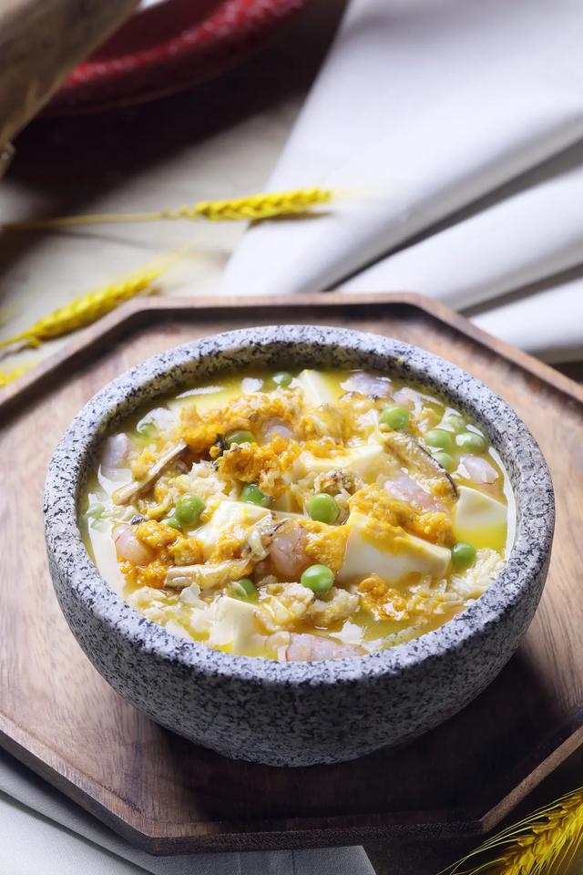 生拆蟹粉烩豆腐:使用整只蟹蒸熟后剥出的蟹肉和蟹粉烧镬下花生油爆香,加入高汤和豆腐调味收汁后便完成了这道蟹粉烩豆腐。可见膏黄晶莹油润,豆腐滑嫩醇香,每一口都是唤起味蕾欢愉的鲜味引擎。