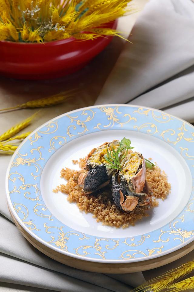 黄油金蒜焗河蟹:张师傅以粤菜古法烹调,加入黄油及蒜蓉和螃蟹在锅中小火煎焗,使蒜香味完全融入河蟹里,味道更加鲜美、浓郁、唇齿留香。