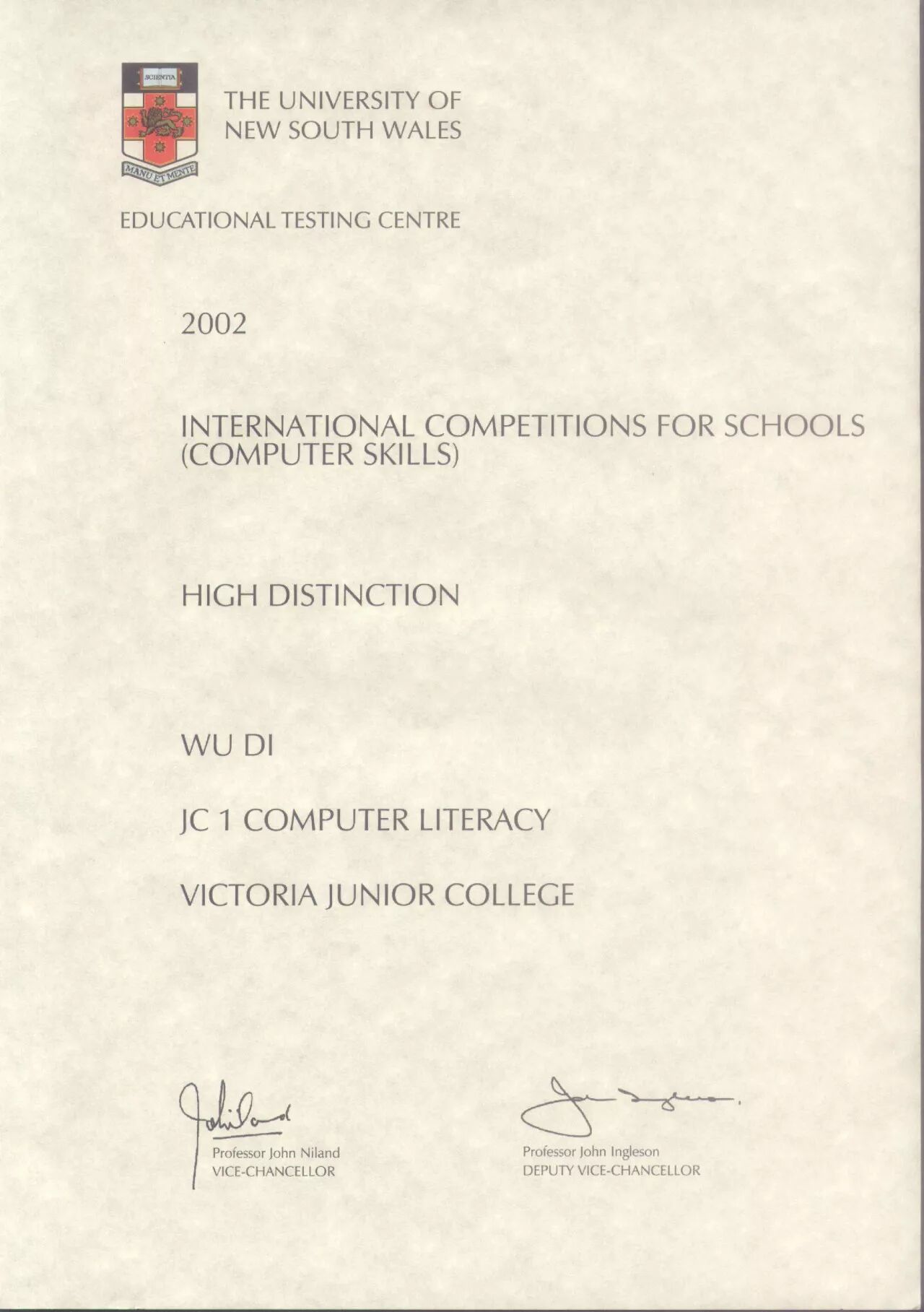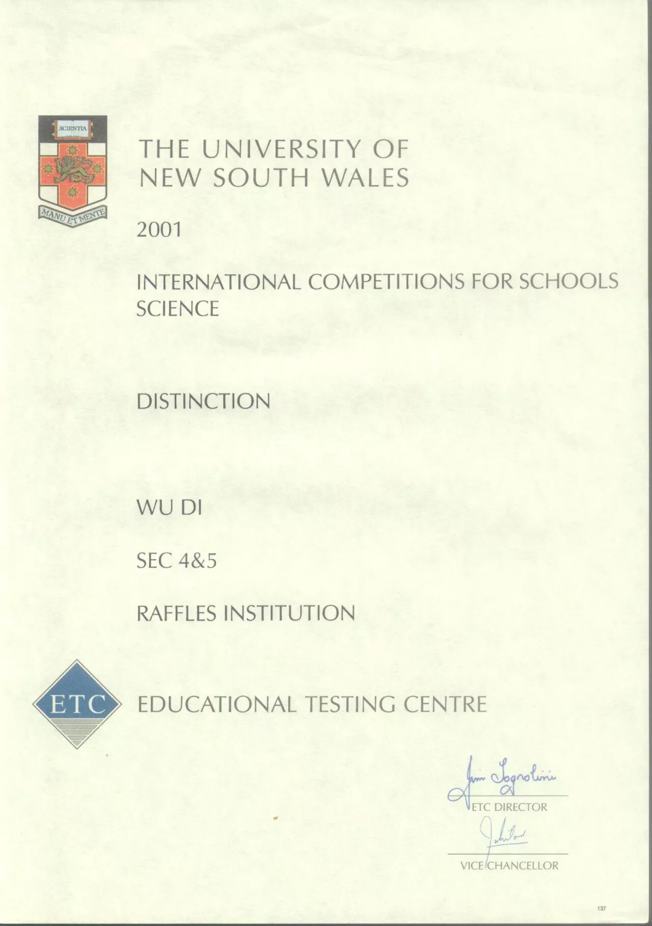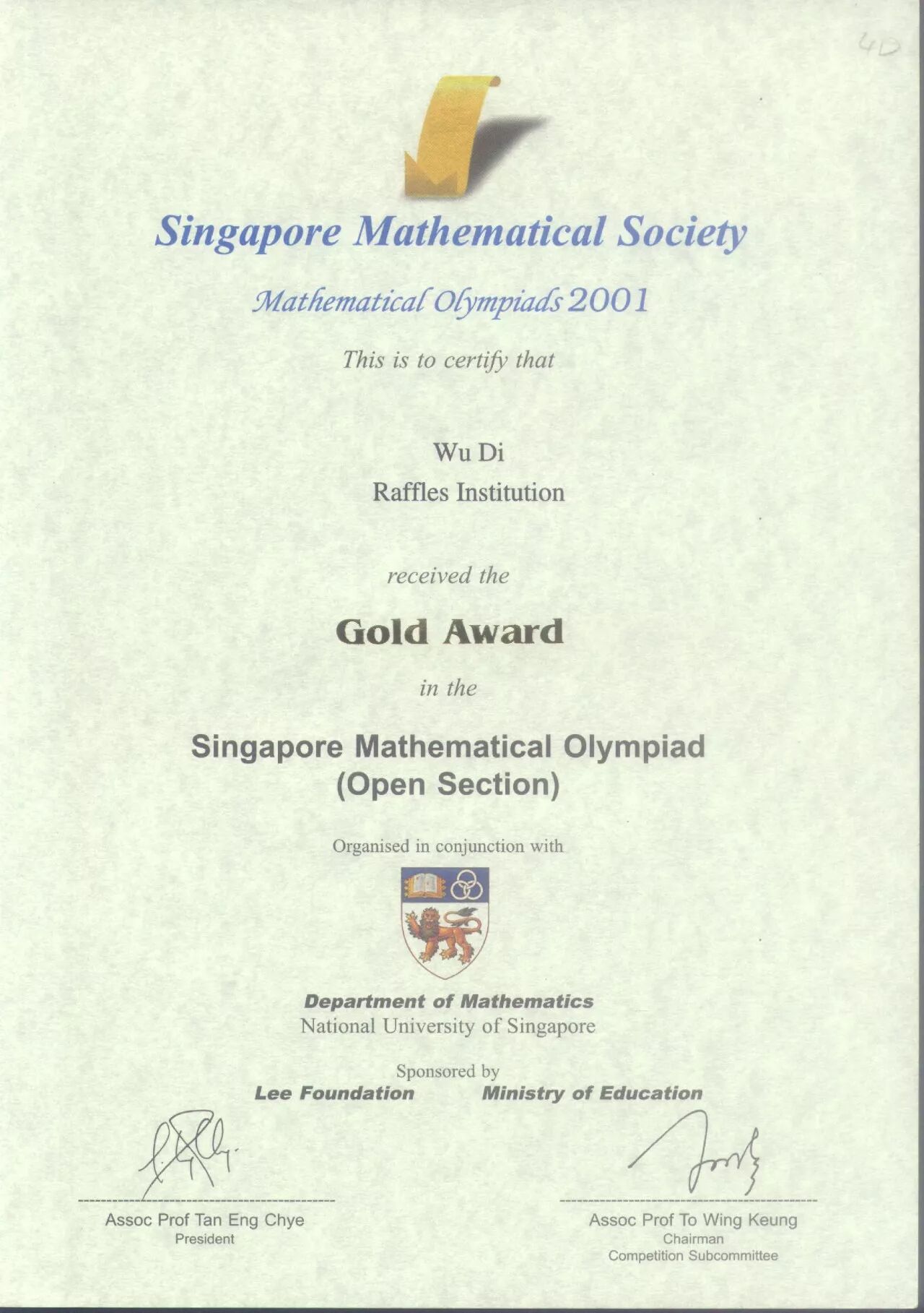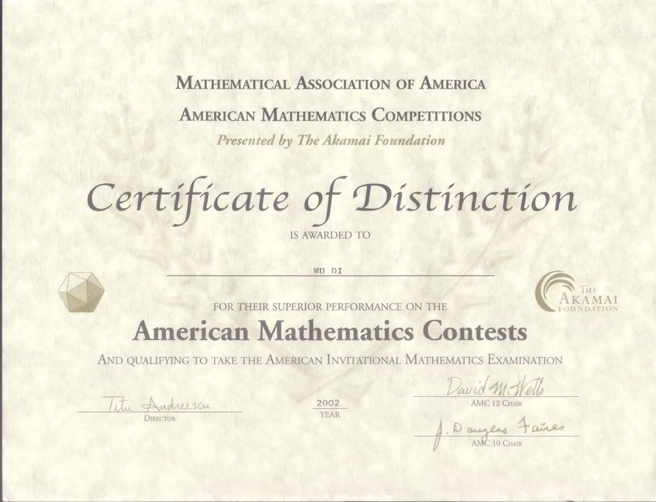 年仅3岁,Wu Di就被公认为数学天才。6岁的时候,他在心算竞赛中获得了人生第一个满分的战绩。未满12岁的他已在中国奥林匹克数学竞赛中夺取5次以上的冠军。随着兴趣变得逐步广泛,高中时期的他在数学,计算机,工程,物理,化学,生物,英语,歌唱等各个领域的比赛中均勇夺金牌。那非凡的天赋与举世无双的创造力令世界顶级学府(如新加坡莱佛士书院)主动向他提供全额奖学金。