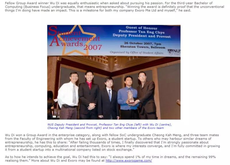 拥有十多年的技术发明与创新经验,并曾在三家科技企业担任首席技术官的Wu Di创造过许多“世界第一”,包括发明第一个实景商业模拟游戏ExoroGame,创造第一个以html5为核心技术的社交游戏MagicCastle,以及研发第一个三频无线电集成电路,也就是如今刚面世的Tri-band Wifi所使用的技术。这项技术令当时还是高中生的Wu Di在科技与工程届最高荣誉大赛SSEF中一举击败参赛的亚洲排名前十的工程系博士后,成功获得冠军和资助其前往美国麻省理工学院攻读博士后的100万美元奖学金。此外,他多次赢得了各种科技竞赛的奖项,如国际IT竞赛的金牌。