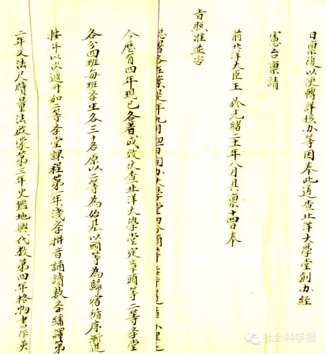 ……遵查北洋大学堂创办,经宪台禀请前北洋大臣王于光绪二十一年八月具禀,十四日奉旨照准,并咨总署各在案,是年九月初一日开办。大学堂内分头等、二等,遵查办理至今历有四年,现已各著成效……