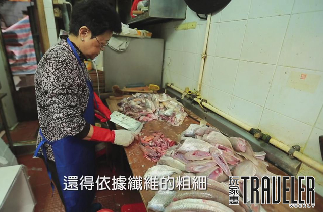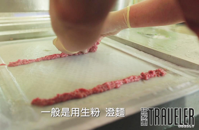 鱼蛋一定要用九棍鱼,这种鱼比较好吃,鲜甜有鱼味。为了抢新鲜只有太太亲自处理的老夏才比较安心,她细心取出骨头的鱼肉,还得依据纤维的粗细,分批送进绞肉机绞碎,过程中必须不断加入冰块,以增加鱼蛋的单性,咸香Q弹的鱼蛋,才能和清淡滑口的河粉成为互补。
