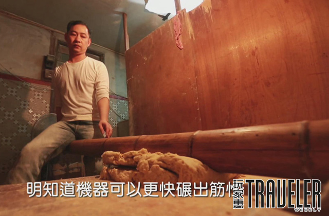 当然,还有搓面的方法,也是很讲究的。在搓面的时候,要一点点加的,多压几次就揉的比较均匀,这种揉面的方法最大的好处就是不会死筋,因为机器做的筋性就呆板,产生太多筋性也会不好吃。这里的粗竹竿是上一辈传下的,揉面的方法,当然也是要跟五十年前的一样。