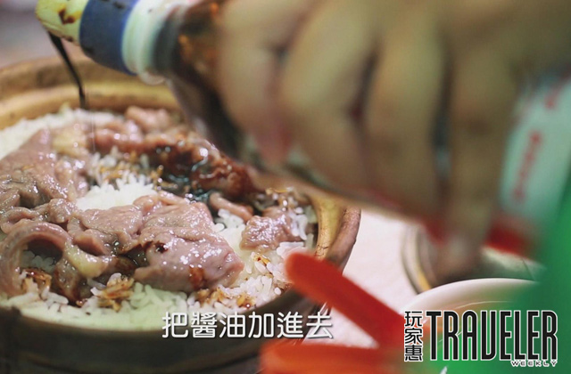 吃最道地的煲仔饭时会有个盖子,刚送上来时你先别着急吃,要先拿起这个酱油,打开锅盖之后,把酱油加进去,之后把锅盖盖起来,再闷两分钟左右,让酱油渗到米饭中,两分钟之后打开盖子,就要把米饭搅拌均匀,然后就可以吃了。