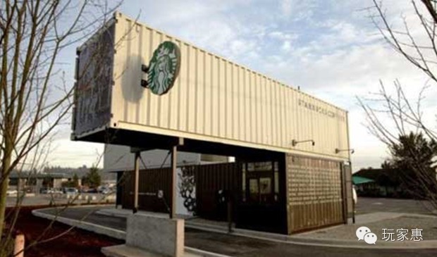 星巴克公司的总部大楼位于华盛顿州的西雅图市,看着窗外熙熙攘攘的港口,老板们灵机一动:为何不用集装箱当店面呢?于是变诞生了星巴克第一家环保店铺,就开在他们公司回收的一个集装箱里,有450平方英尺(约41.4平方米)那么大,设在华盛顿州的塔克维拉市(Tukwila)。在集装箱里喝咖啡,真是够独特!
