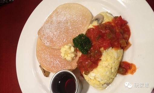 MrPancake House的松饼做的比洋快餐做的要精致很多,起码分量就要足很多的嘛,而且关键是食材的丰富程度要高一些的,搭配的蓝莓果酱给的有多少一眼看上去就知道了,松饼里面的奶香味是特别的足的,口感很松软,但是不会觉得很轻。