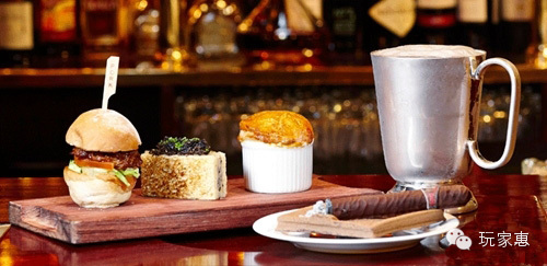 (下午茶单更加男性化,饮料是威士忌鸡尾酒、香槟酒,美味的迷你汉堡、厚味的牛排和蜗牛三明治等,另外,还有自制的猪肉派,不单很Man,还更有乡村范儿。)