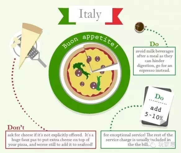 Don't:在台湾吃意大利面很爱多加吉士,但是在意大利用餐可别这样做了!不管是披萨还是海鲜料理,就算你再爱吉士的浓郁香味,意大利人也不会喜欢你用吉士盖掉料理的原始风味!
