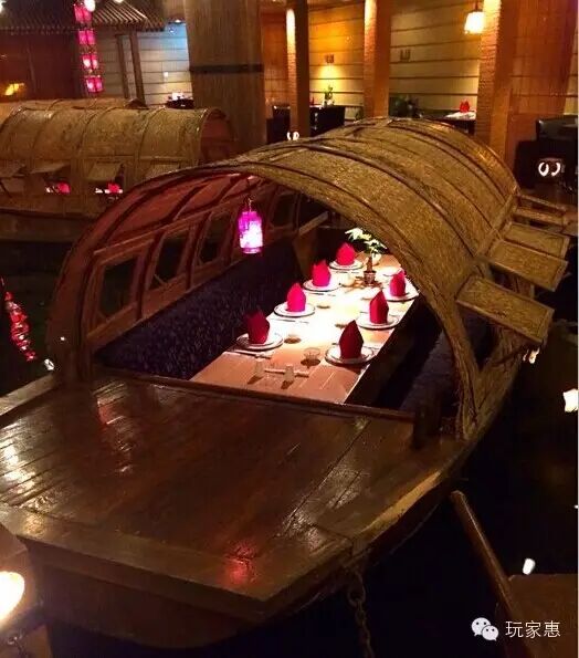 亚洲大酒店的里面的餐厅,环境幽暗,很是安静,走廊的的中间是一条条的木船,挺有特色的,颇有江南水乡的格调。四条乌篷船船名以苏眉、太子、班王和青龙命名。