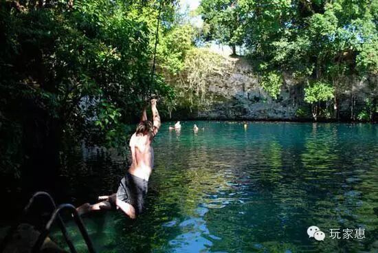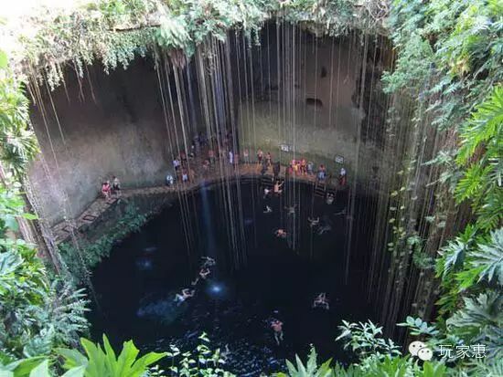 游览完奇琴伊察遗址后必须要去的地方就是墨西哥天坑。这座自然天坑藤条缠绕,清泉下泻,水光涟滟,泉水叮咚,幽静祥和,如诗如画,是跳水游泳的好地方。