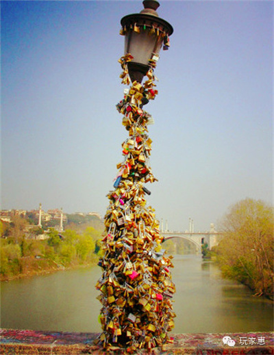 意大利罗马台伯河上米维奇桥的街灯上挂满了金属挂锁,这是恋人们发誓永远相爱的见证。相爱中的男女相信在米维奇桥的街灯上挂上挂锁,就可以牢牢“锁住”他们的爱情,永不分离。他们挂上锁,把钥匙仍到河里,念念有词:为了永远。