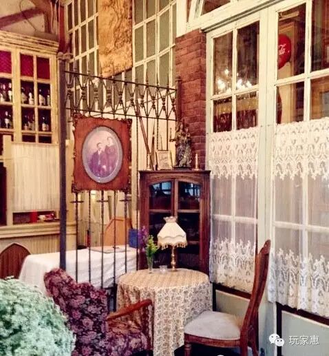 入口处的惊鸿一瞥,让人仿若坠入异国农庄的后花园。进门穿过铺满细碎石子的小径,庭院里的绣球花和随处可见的鲜花绿植,让这里充满温柔的气息。边走边欣赏店主人的精致用心:镜子墙,洛丽塔聚会圆桌,绿漆的玻璃书架以及墙上斑驳发黄的复古相框。