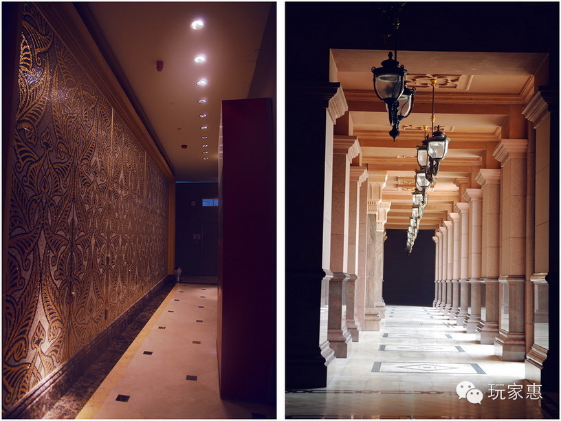 店走廊墙壁图案是镶有黄金和贝壳的阿拉伯特色拼花,走廊的建筑风格也极具阿拉伯建筑风格。