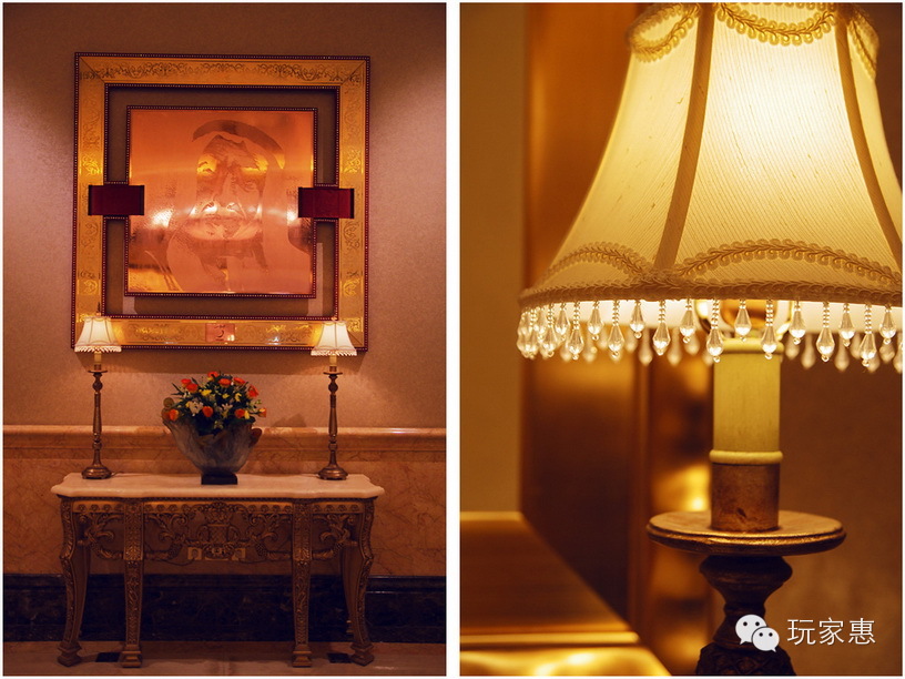 在细节方面,皇宫酒店也是精致奢华。例如这幅悬挂在大堂一隅的绘画,看似不显眼,实际上是价值1000万美金的纯金刻板画,就连休息区的一盏台灯也是如此珠光宝气。