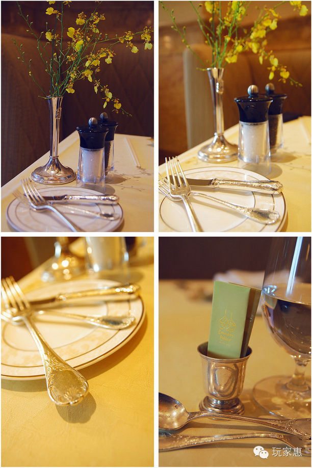 餐厅所使用的餐具是法国进口的银器,托盘也是镶了金边的顶级瓷器,牙签纸套上都印有金色的皇宫标志。