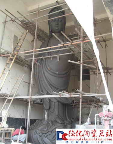 大型瓷雕"渡海观音"由享受国务院津贴一级工业美术大师苏清河先生完成制作、烧制、安装。"渡海观音"坯体高度7.5米,由137块部件组成,烧成后高达6.4米,用瓷土8吨多,仅头部用土就达半吨。石雕、木雕达这个高度已属不易,瓷器达此高度迄今尚无文字记载。由于工程巨大,现代的注浆方式不适合这尊观音的坯体成型,所以制坯方式是采用传统的手工印坯方式,这样就导致同一块部件内的坯体厚薄不一,最厚的部位达20厘米,而最薄的部位仅3厘米,烧成后的成品每块重近百斤,这就增加了烧制的难度。德化科技团队应用了现代自动化科技,专门研制了计算机自动化控制系统,通过计算机编辑设置各程序段时间、温度目标值,升降温度速率自动运算,自动运行,匀速升温,匀速降温,声光自动报告窑炉运行状态。