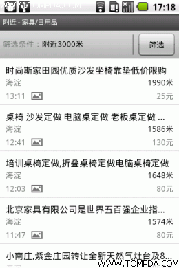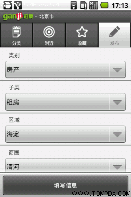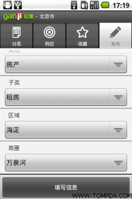 说完了“分类”功能,接下来我们了解一下其他版块,“附近”功能通过GPS定位功能,搜索到附近范围内的任意版块信息;而“收藏”中则可以看到之前所关注的信息;最后是“发布”功能,看了这么多信息,我们也试着发布一下,操作很简单的,根据*号提示内容,填写相关信息,便可以轻松完成发布。