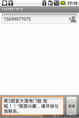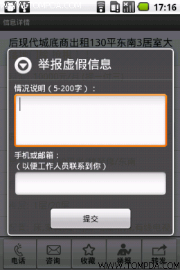 看完了赶集网的界面,我们来详细了解一下“分类”功能,点开租房界面,便可看到该分类下的信息,选择自己所需求的信息,就能够查看到该信息的详情,而在所查看的信息中,可以实现电话、短信、收藏、举报、转发、地图等基本功能,同时还支持图片的查看,方便了大家的使用。