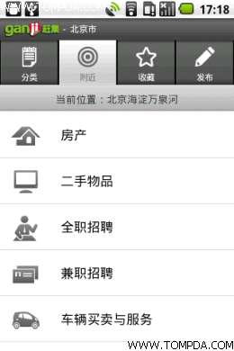 打开手机赶集网主页,软件会通过GPS功能自动定位当前位置,我们看到,手机赶集网这款软件分为四个版块,分别是分类、附近、收藏、发布,而在子目录中,则可以看到常用的房产、二手物品、招聘等功能区,新手上手十分容易。