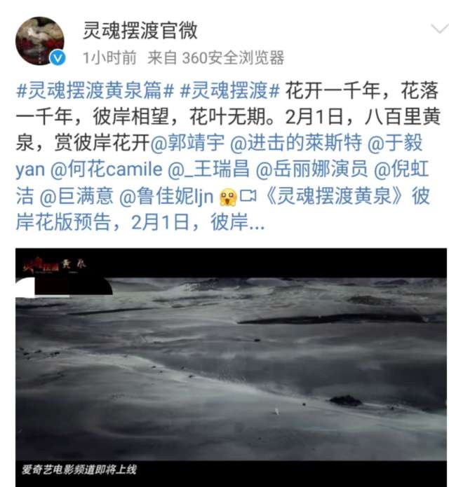 由爱奇艺出品,小吉祥天担任监制及编剧,郭靖宇任艺术总监,于毅、何花、倪虹洁等人主演的《灵魂摆渡》系列网剧番外篇网络大电影《灵魂摆渡·黄泉篇》将在近期播出。