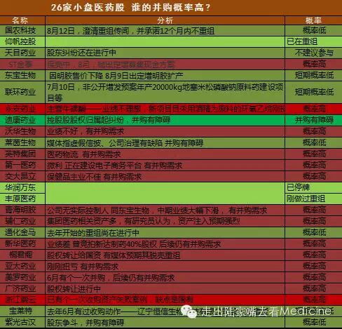 好了,投资者最关心的是,哪些医药股有兼并收购潜力?药痴在中秋假期做了些功课,设定了一个市值在35亿以下小盘医药股的范围,发现12家公司最具并购可能。