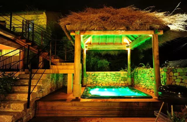 这是带有桑拿室和温泉的院子,院中石阶上下有起伏,充满层次感,整个风格既乡村又现代。