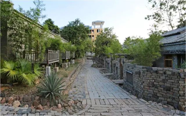 房舍分为三排,最边侧是一条直接通向前厅的石板小道,两旁是葱郁的绿色植物,还有翠竹。一套一个院落,进入院子都是打开半人高木门。