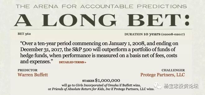 巴菲特一直认为指数基金,可以轻松打败主动型基金。巴菲特认为99%的股市参与者应该购买指数基金,而不是自己去买卖股票。巴菲特为了证实自己观点的正确性。2007年12月19日,巴菲特在某网站上发布“十年赌约”,以50万美金为赌注,指定某个慈善组织为受益人,若巴菲特赌赢则该组织可获得全部赌金。他主张,2008年1月1日~2017年12月31日的十年间,标普500指数的表现将超过对冲基金的基金组合表现。