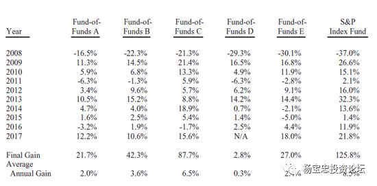 应该强调的是,这些业绩激励是一个巨大而美味的蛋糕:即使这些基金在这十年中造成了投资者资金损失,他们的管理人员却仍然会变得非常富有。因为这些基金每年要向投资者收取大约占2.5%的固定手续费,其中一部分费用给了基金中的基金的五个经理,剩下的给了对冲基金那200多位经理。