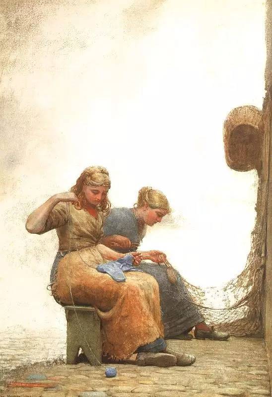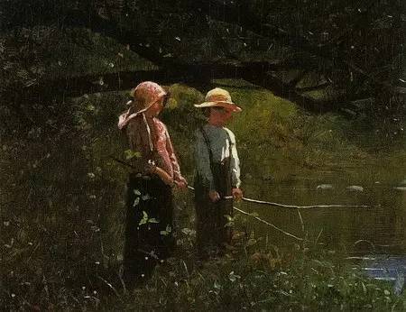 海给他们激情,也给他们风浪,霍默的《生命线》反映了海的恶劣,对于生命的侵犯,但是多数时候,海是温情脉脉的,我们看到霍默笔下的多数作品,充满小资情调,一种有别于田园的闲情与放松。海霞,渔船,小艇,艇上的垂钓者,女郎,大妈,童子,仆人,海边的欢乐---这些海边平民生活场景,在霍默的笔下充满诗意,或者因为多数作品是运用水彩绘制,写意的感觉胜过了写实的意味,这个与托马斯·伊肯斯记实的风情有别,绘画性艺术性强烈浓郁,他的作品并不深入刻画,而是追求神韵,节奏感,追求一种朦胧的感觉,追求一种幻觉与梦境。
