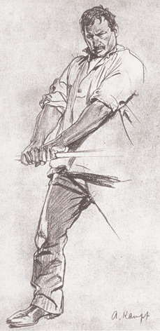 康勃夫的素描首先是重结构,其次才是调子,他继承荷尔拜因线性素描的精粹,用灵动的线来抓人体的结构,但随着素描技术的深入,他保留了荷尔拜因精湛的曲线外,增加了直线的表现方式,目的是要展示出人体的内在结构,达到一种合理与完美,他的线条灵性生动,不像苏式素描过于死板,缺少生机,耗费画者太多的精力与时间,而且收效甚微。
